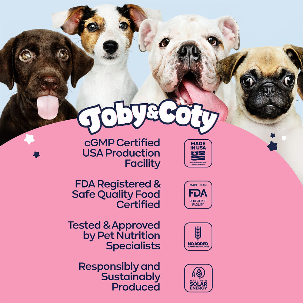 Our custom-formulated soft chews contain no cheap fillers, silicon dioxide, maltodextrin, corn, soy, or wheat. Just the best possible ingredients for your dog.